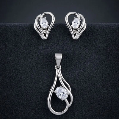 The pendant is gracefully crafted with a sleek silver-tone finish that enhances the brilliance of the centerpiece stone, while the matching stud earrings perfectly complement the design, creating a harmonious and sophisticated look. The simplicity of its design makes it incredibly versatile—ideal for both everyday elegance and special occasions.