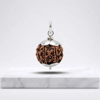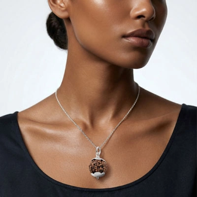 A powerful Rudraksha pendant with a polished silver-tone finish, believed to offer protection, peace, and spiritual strength for everyday wear.